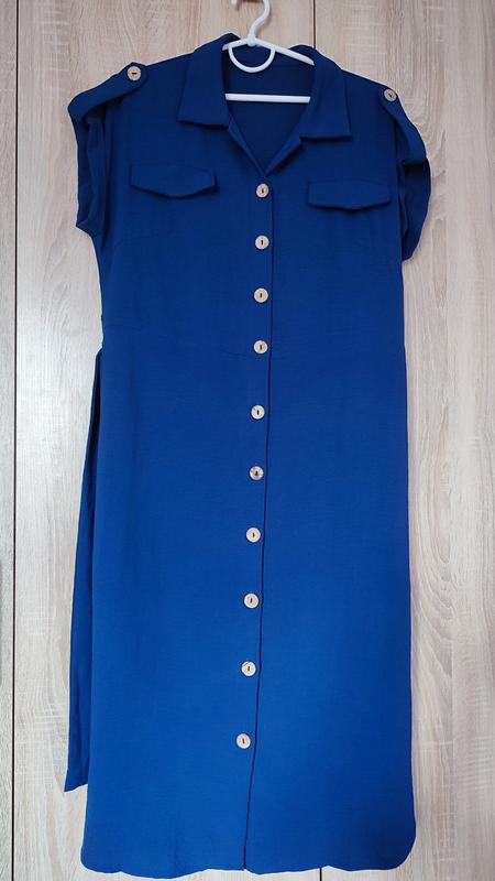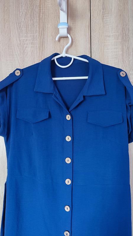 Стильна сукня-сорочка в ідеальному стані. Колір синій, з дерев'яними ґудзиками. На грудях імітація кишень. Є плям. Красива, фірмова, легенька, якісна.Заміри:ПОГ і ПОС 55ПОТ 50довжина 113