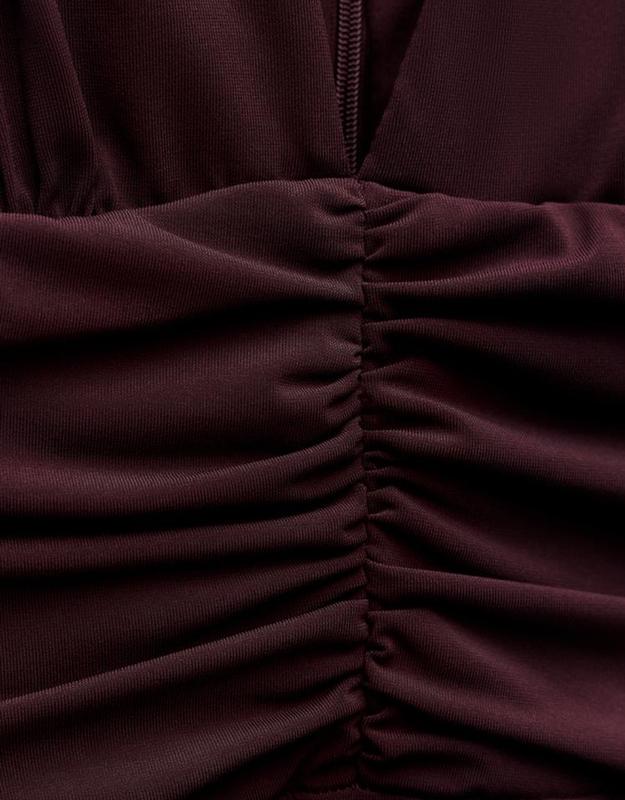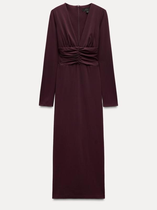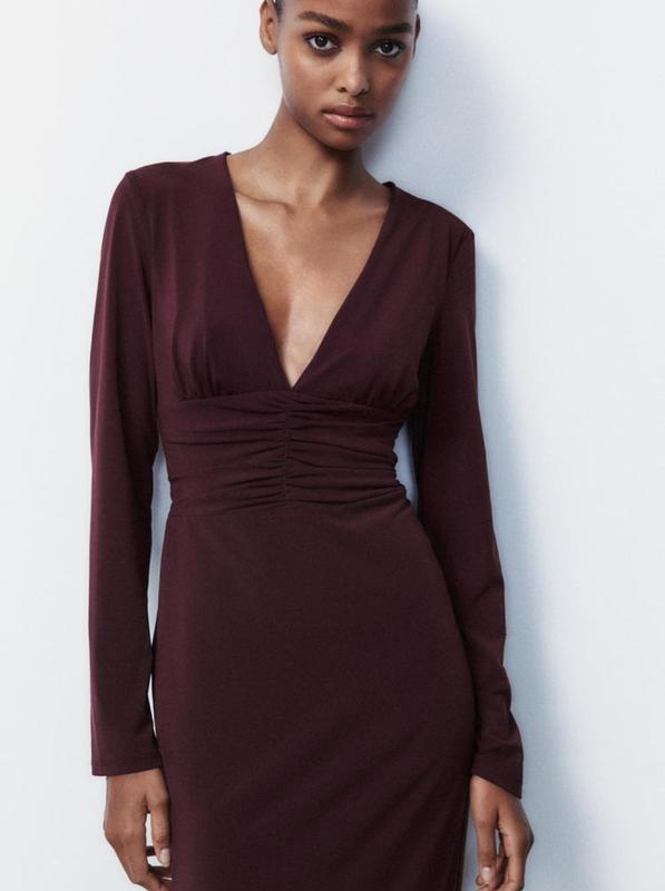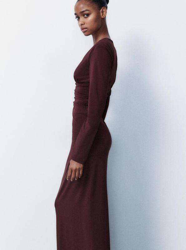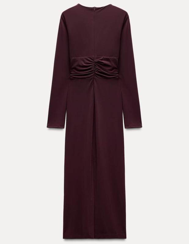 Трикотажна сукня середньої довжини з вирізом у вигляді літери V і довгими рукавами. Має підкладку, зборки та розріз ззаду внизу. Застібається на приховану блискавку.
