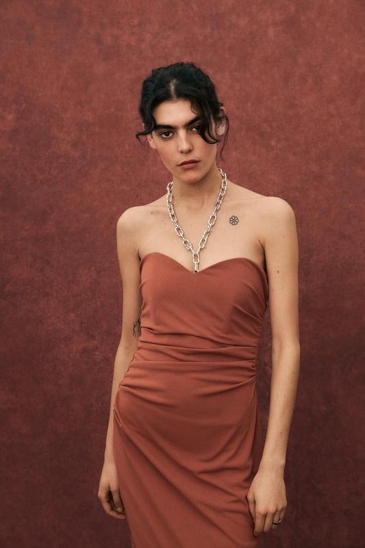 Трикотажна сукня середньої довжини. Виріз у вигляді серця та відкриті плечі. Зборки. Розріз ззаду внизу. Прихована блискавка.Цеглястий | 2319/262/701