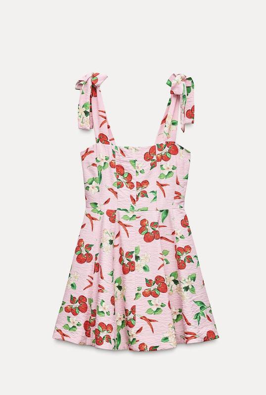 Стильное легкое платье zara с бантами на плечах в принт вишни