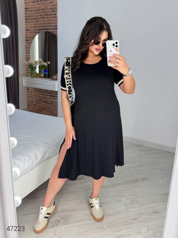 Сукня з коротким рукавом. До низу спідниця розширена (трапеція), з боків розрізи, на рукавах оздоблена лампасами.