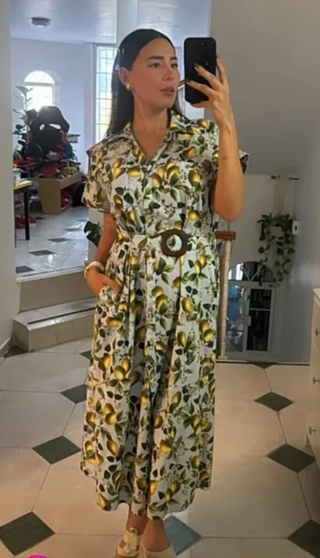 Сукня міді з принтом "фрукти" ZARA S, M Сукня з відкладним коміром та короткими рукавами з відворотами. Передні накладні кишені, ремінь із тієї ж тканини. Бічні кишені у швах. Застібається на гудзики. 100% бавовна