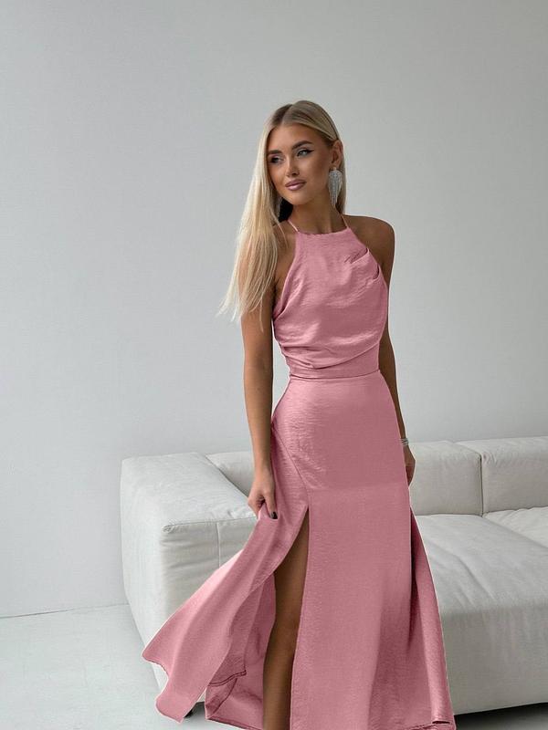 Жіноче літнє плаття рожеве з відкритою спиною та розрізом на нозі, тканина жатий шовк