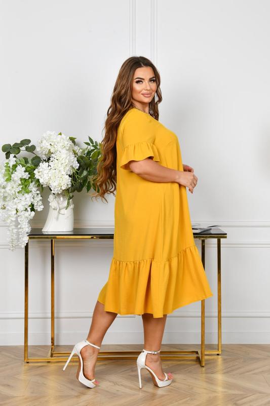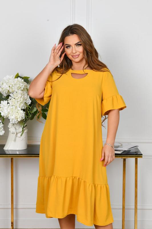 Силует сукні А-подібний, низ та короткий рукав декоровані воланом. Горловина кругла, оригінально оформлена. Кишень та застібок немає.