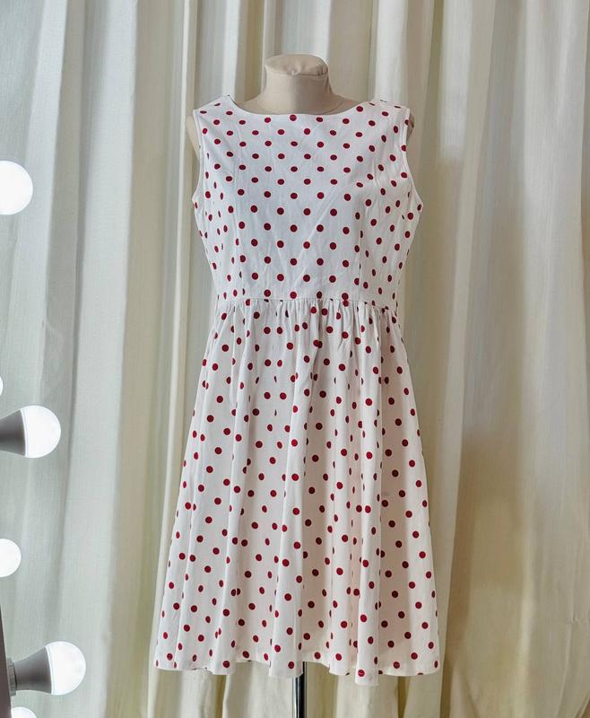 Сукня жіноча біла в червоний горошок LINDY BOP🛍️❤️🔥Розмір - UK 14-16/ EUR 42-44/ USA 10-12/ L-XL / 50-52. Склад : 97% бавовна, 3% еластан. Підкладка: 100% бавовна. Виробник Китай. Сукня з попліну з додаванням еластану, відрізна по талії, вгорі з підкладкою. До талії з обляганням, від талії призібрано, є бокові кармани в швах та довга змійка спини. Додаткові заміри: повна довжина 100 см, довжина від лінії плеча до талії 40 см, довжина від талії вниз 60 см, ширина плечей 40 см, напівобхват грудей 52 см (повний обхват 104 см), напівобхват талії 43 см (повний обхват 86 см), напівобхват стегон 75 см (повний обхват 150 см).