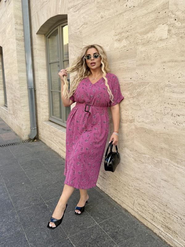 Сукня (плаття)+пояс жіноча довга міді креп жатка 46-60 в квіти фрез рожево-фіолетова