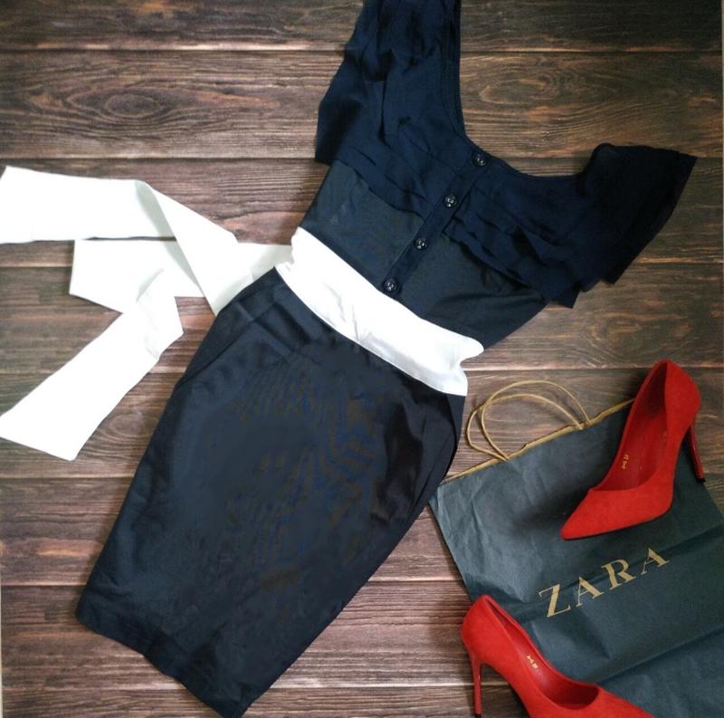 Брючное темно-синє плаття з поясом стрічкою міді , нове без бирки, щільне, шикарне якість, рр М 10, зверху шифон