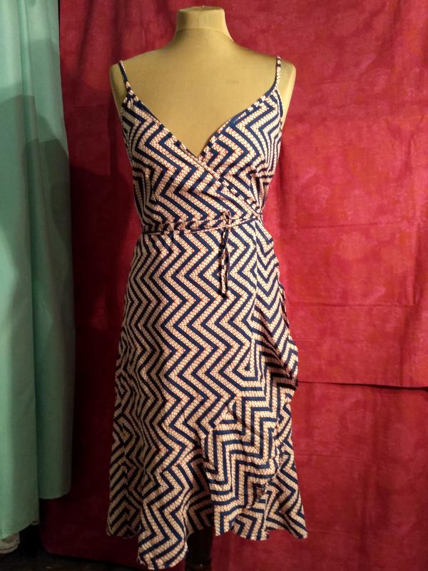 : Сукня на бретельках з найтоншого батисту, на запах - розгортається, як смуга тканини і обертається навколо фігури і зав'язується тонким паском навколо талії, є виточки, відрізне по талії, на подолі сукні пришита широка присобраная оборка, передній край подолу закруглений. Тканина дуже тонка і легка, колір яскравий червоно-синій "зигзаг". ТКАНИНА: 100% бавовна РОЗМІР: М СТАН: дуже гарне ЦІНА: 220 грн. Двиробу = 102 см ПОГ = 50 + см
