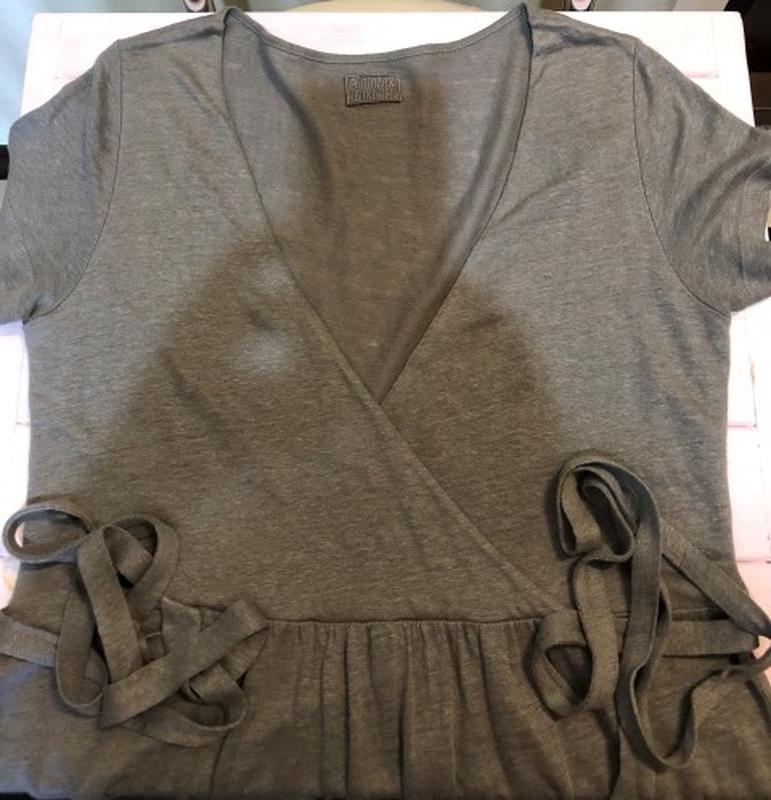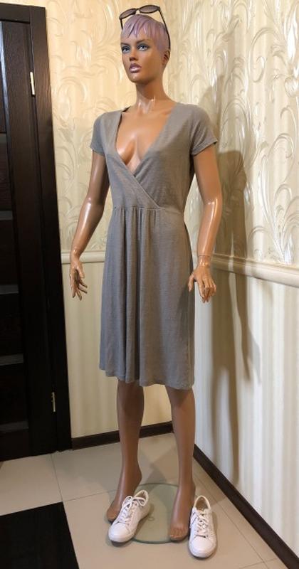 Комфортное летнее платье серо-бежевого цвета, свободного кроя с отрезной линией талии и длинными завязками по бокам, которыми можно обвить талию либо завязать сзади, грудь на запах (перед до линии талии двойной из той же ткани). Бренд BLAUMAX (Австралия).