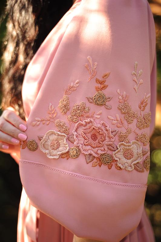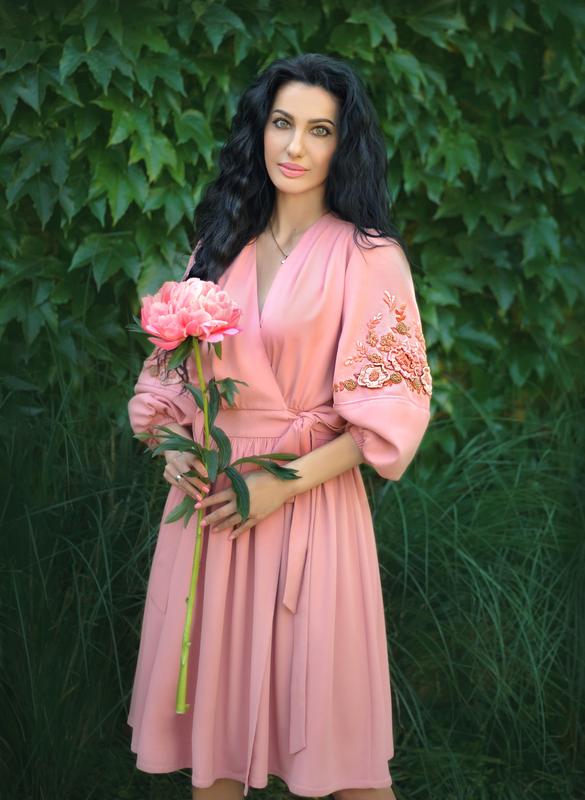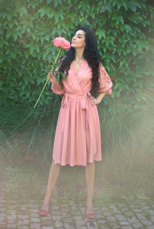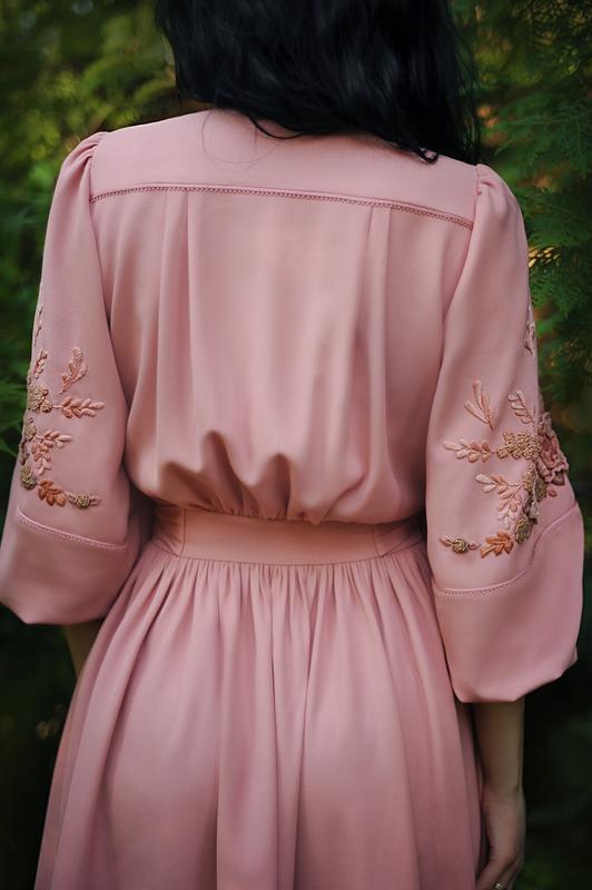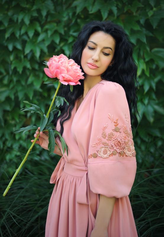 Чарівна сукня з унікальною ручною вишивкою в тон тканини. Тканина виробництва Німеччини – 50% віскоза, 50% бавовна. Тяжка, красиво лягає складками, добре драпірується. Силует сукні підкреслює талію, запах фіксується двома зав'язками. Цікавий крій рукава підкреслено унікальною об'ємною вишивкою ручної роботи. Ідея та ескіз вишивки авторські, аналогів немає. Цілком незвичайна, витончена і благородна сукня для особливих подій, тішить око і приковуює погляди оточуючих. На замовлення у розмірі клієнта – 1,5 міс, кількість повторів обмежена.