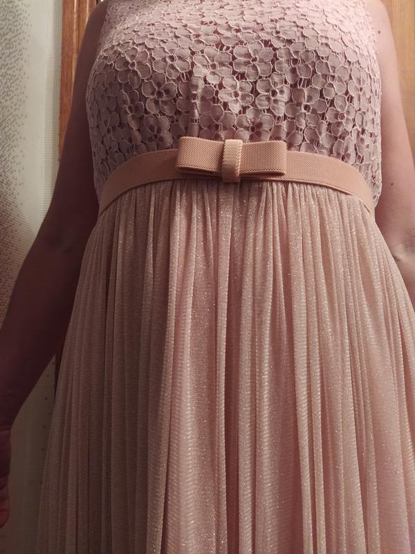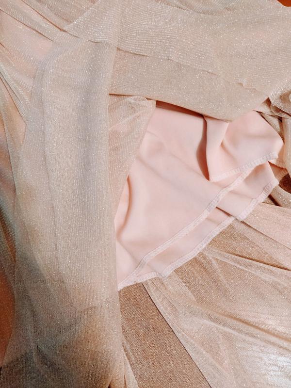 Плаття нарядне, було одягнено один раз, на випускний. Купувала набагато дорожче, турецьке. Спідниця сукні дуже гарно переливається на сонці і в приміщенні, то що потрібно для гарного настрою. Поясок на сукню тягнеться (резиночка) дуже зручно і приховує всі недоліки. Підійде на 42-44 р. Загальна довжина 105 см, довжина до подьюпника 85 див. ПОГ -42-43 см, ПОТ -33 (завищена талія) . Тканина добре тягнеться. Сукня в живу виглядає дуже ніжно і ніде не сковує. Під плаття є босоніжки brasca 39 р. такого ж кольору. Теж були одягнені один раз.