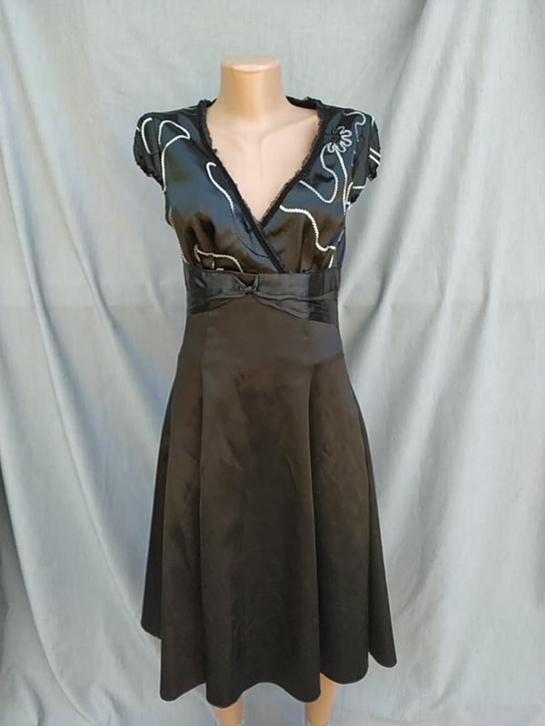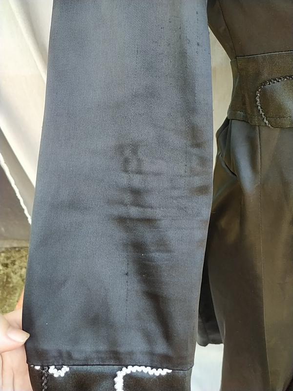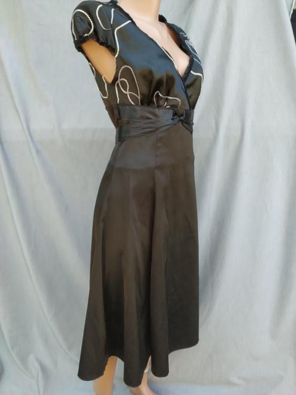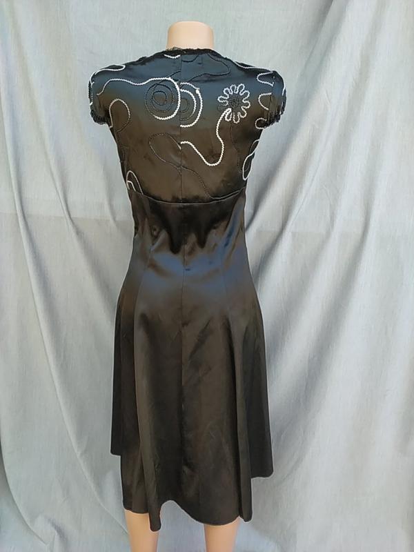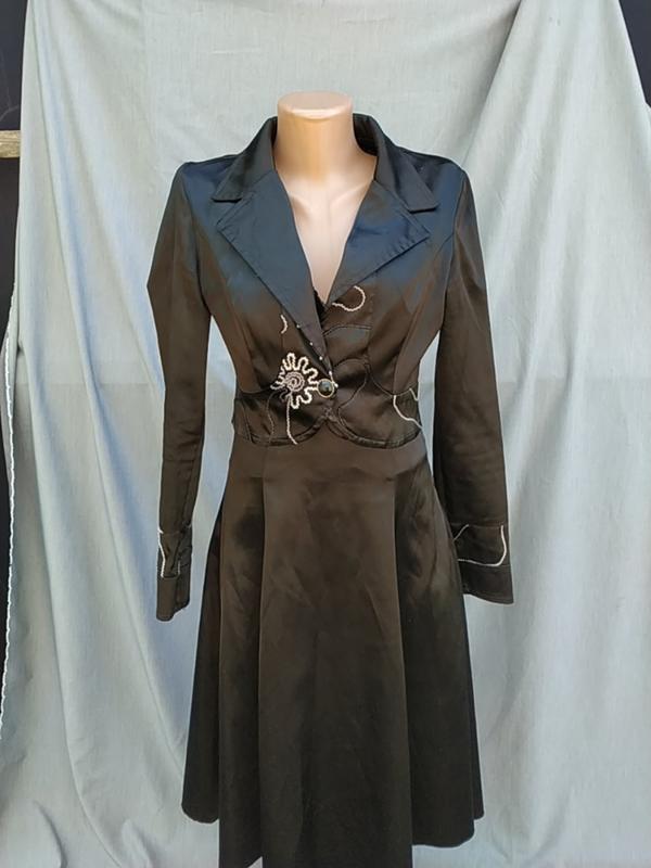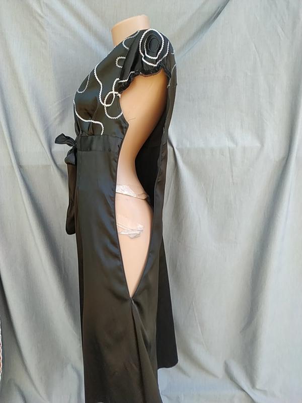Хороша якість щільного атласу. все якісно зроблено. сукня в ідеальному стані а болеро в дуже хорошому, є невеликі затяжки (фото7). на рукавчиках сукні резина, під грудьми спереду стрічка. красива зона декольте. декорована шнурівка "омбре", велика блискавка збоку