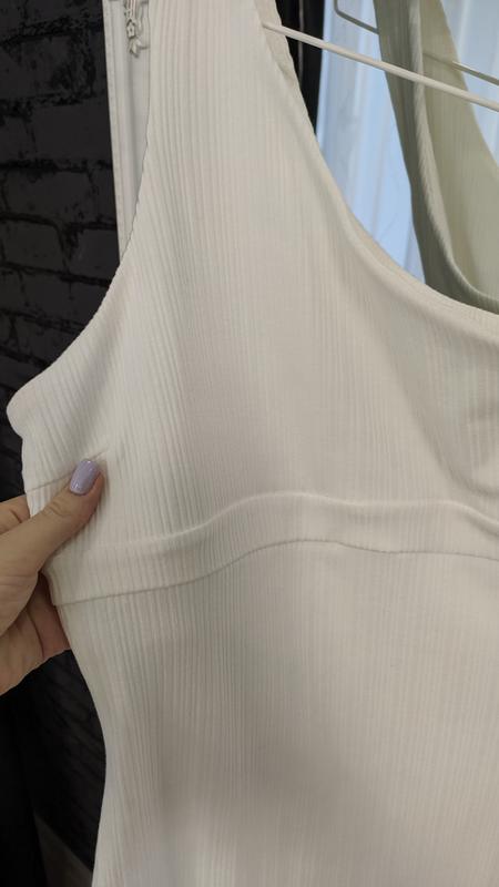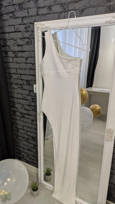 Сукня в рубчик з цупкої тканини на одне плече. Нереально крутий виріз. На підкладці. Відсутній бірочка, так як була зрізана на митниці. Пог 39 см пот 31 см довжина 155 см