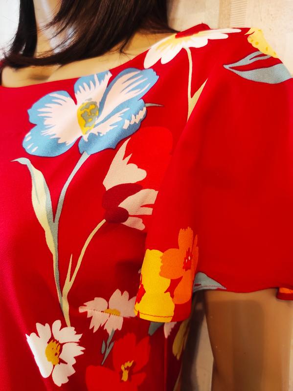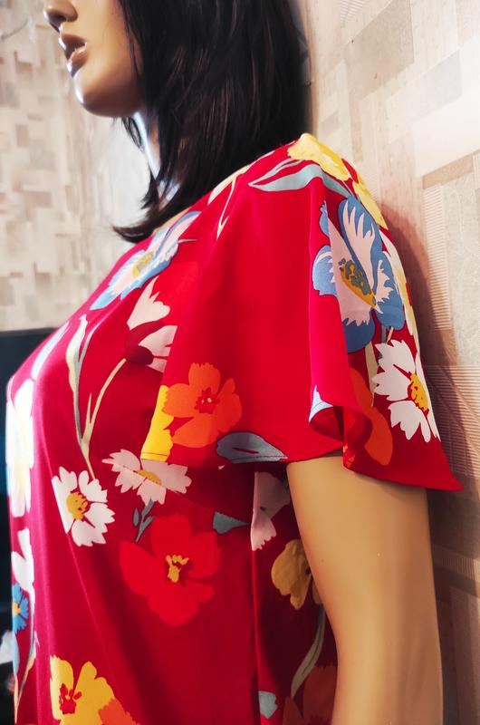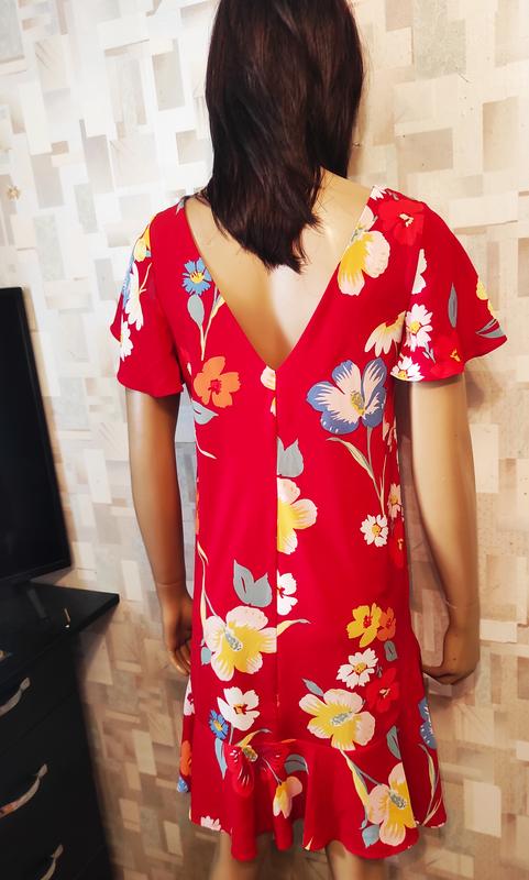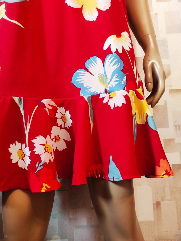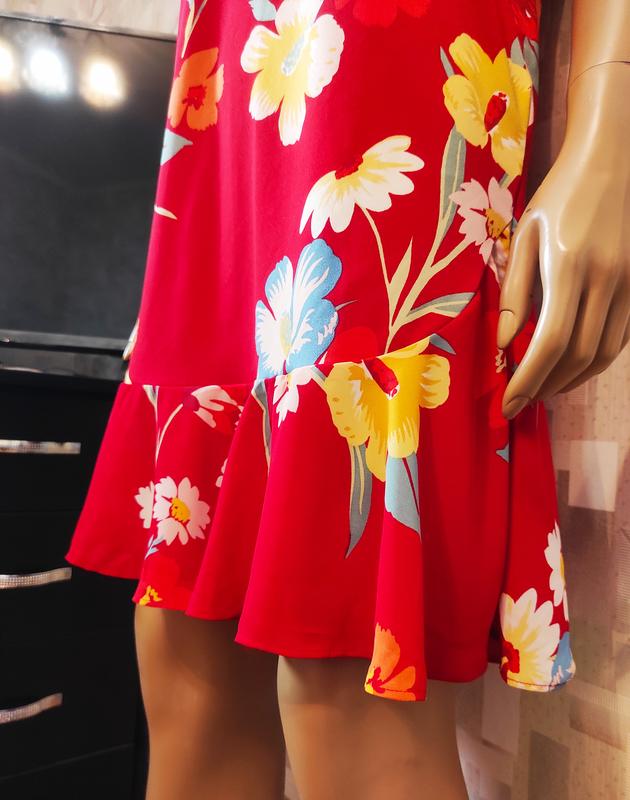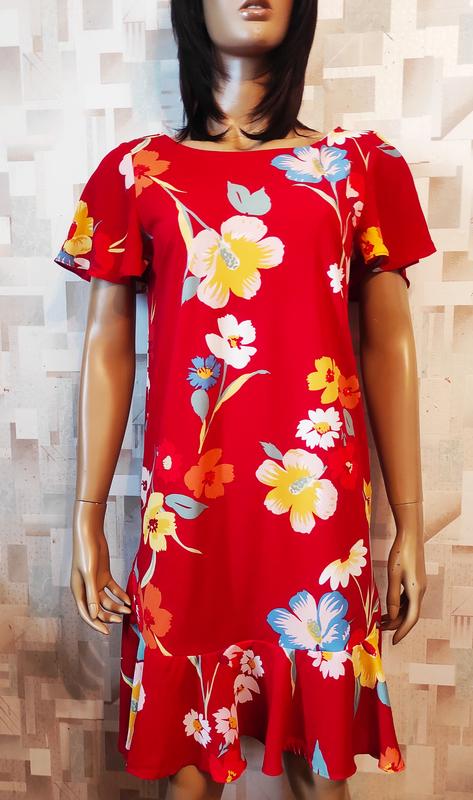 Стильна червона сукня міді з квітами та воланами, розмір М (10). Півобхват грудей 47 см, є виточки, практично не тягнеться, вільна талія, півобхват стегон 50 см, по низу йде волан, на спинці v-образний виріз, довжина 96 см, практично не мнеться, стан нової речі!