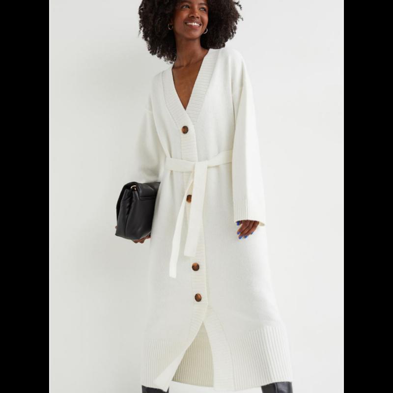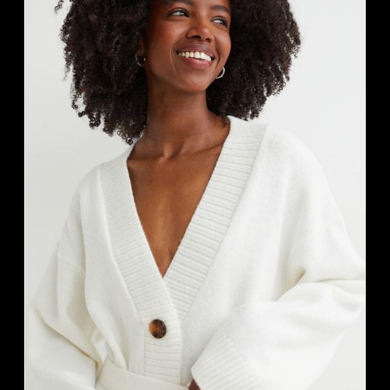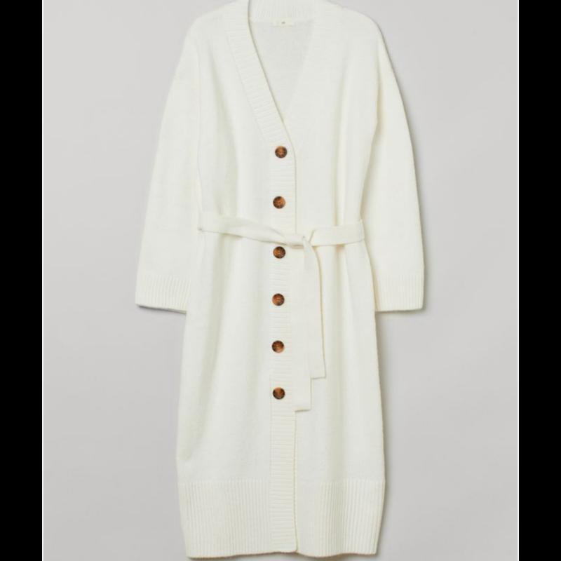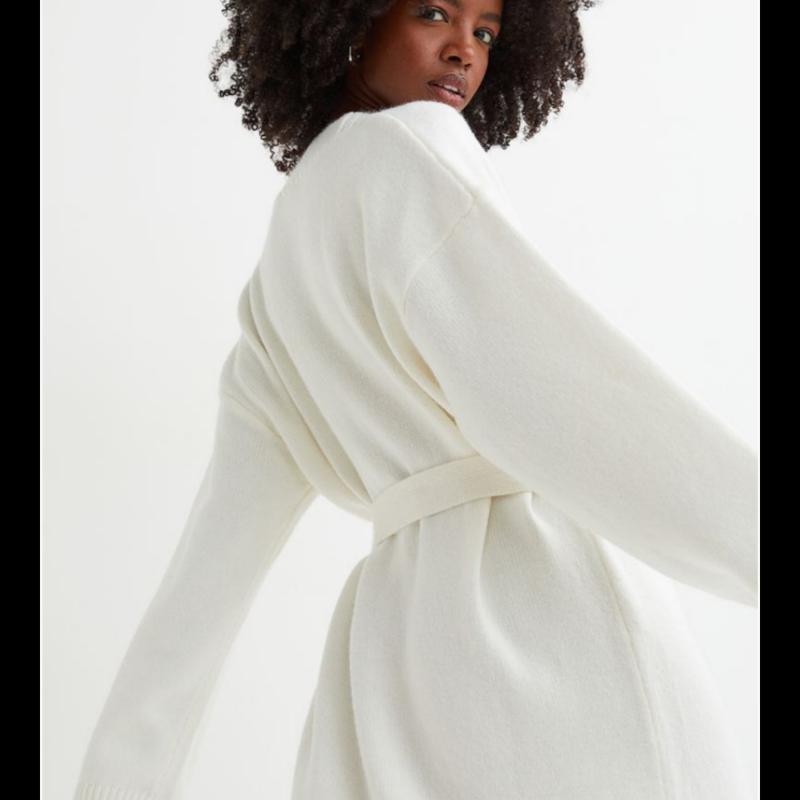 Мягкое трикотажное платье на шерсти, длина по щиколотку. V-образный вырез, пуговицы спереди, съемный пояс для завязки на талии. Низкие плечи, длинные рукава. По низу рукава и снизу трикотажные края в рубчик. Размер - Модель ростом 174 см / 5'9 дюймов носит размер S. Состав Полиэстер 64%, Шерсть 6%, Акрил 30% Более экологичные материалы Переработанный полиэстер 64%