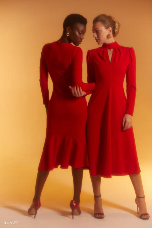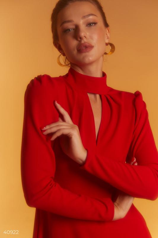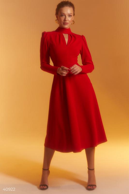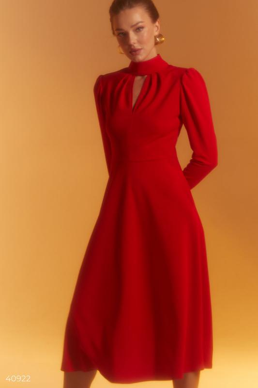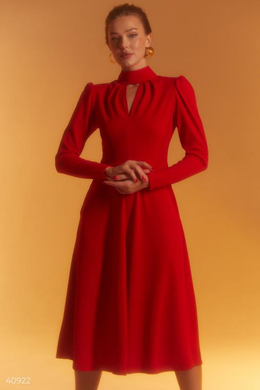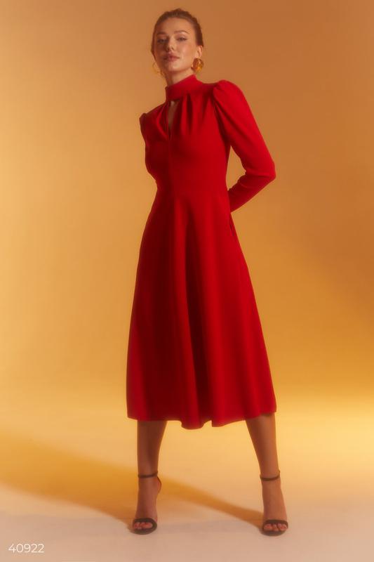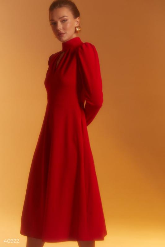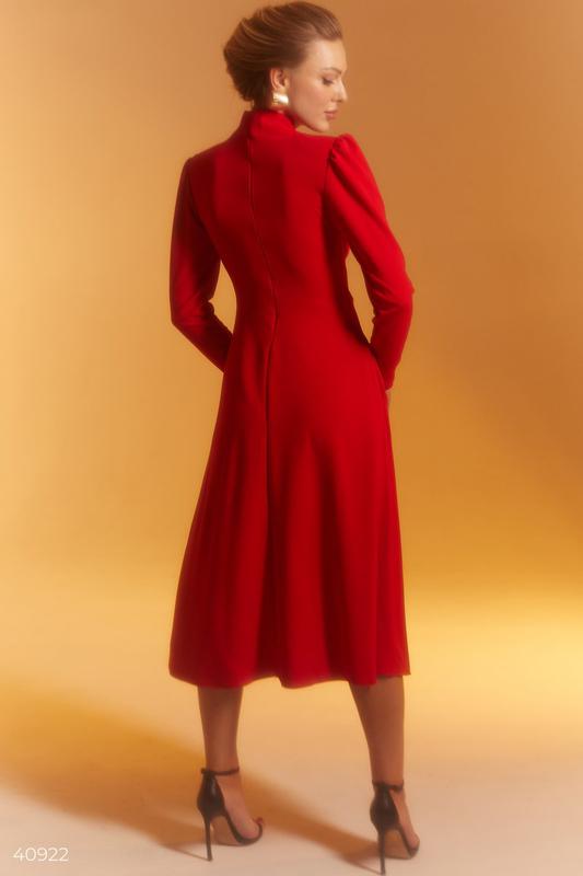 Красное платье с воротником стойкой, небольшим v-образным вырезом. Модель на молнии сзади дополнена трендовыми рукавами-фонариками, в которых предусмотрена эластичная вставка по низу, в плечах поролоновые вставки для поддержания формы. Расклешенная юбка со скрытыми карманами по боковому шву. Создайте образ для выхода на вечер, дополнив его высокими сапогами, или классическими лодочками.