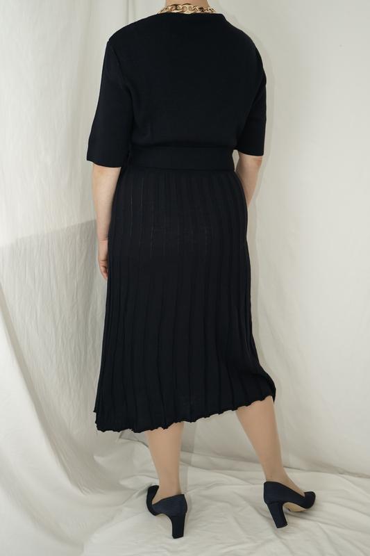 Чудове трикотажне плаття глибокого синього кольору. Спідниця трапецією і в складку, є рідний широкий пояс. Гарно сідає по фігурі. Приємне на дотик і в шкарпетці. Туфлі теж в наявності. Рекомендуємо від душі!!! Розмір – не вказано. Добре сяде на S-M. Надіта на М, ріст 160. Матеріал – бирок немає, по відчуттю шерсть з домішками.