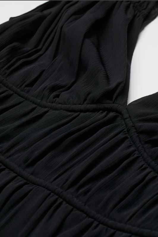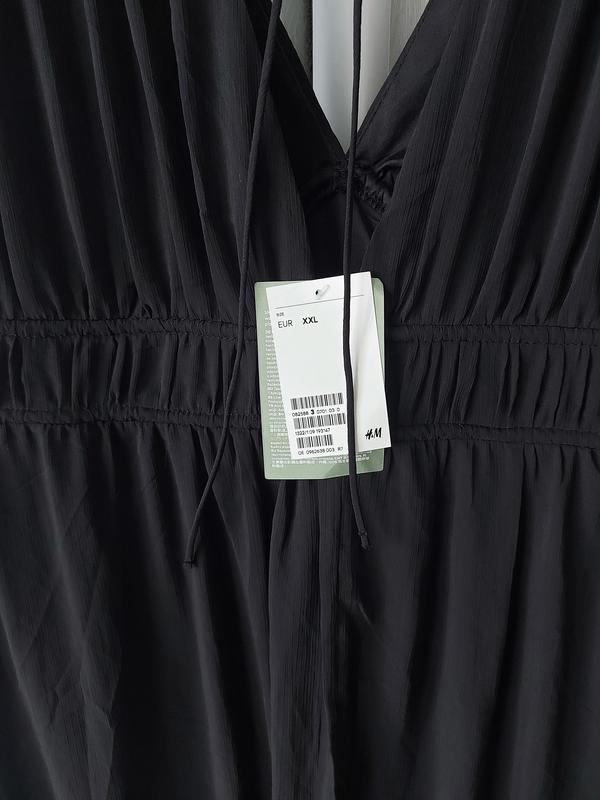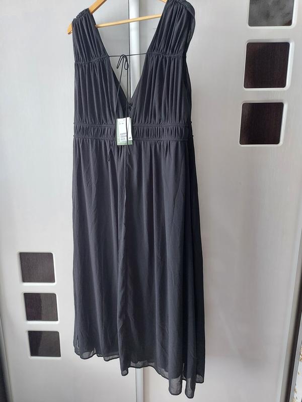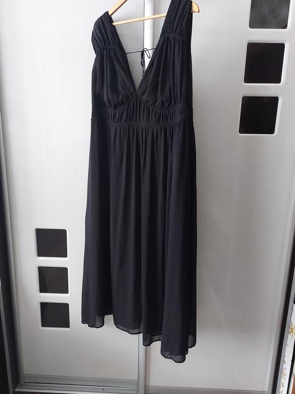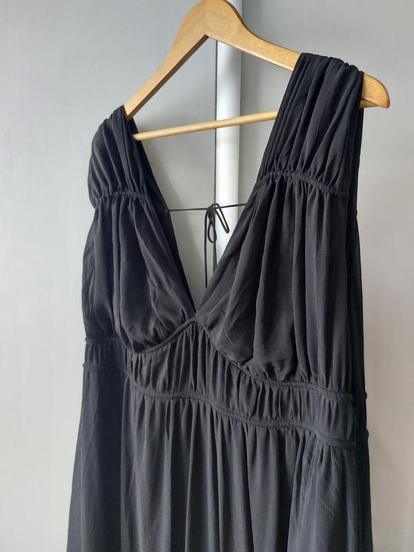 Сукні-міді плаття з V-подібним вирізом Сукні без рукавів завдовжки до литок з жатого шифону з глибоким V-подібним вирізом спереду і ззаду, вузькими зав'язками ззаду і потайною блискавкою з одного боку. Призібрана шви для ефекту легкої драпіровки, шов на талії і трохи розкльошена спідниця. Підкладка із джерсі. СоставВерх: Поліестер 100% Підкладка: Поліестер 100% Розмір XXL довжина 137 див. пог 60 див. піт 54 див. побіди 80 див. глибина вирізу 29 див.
