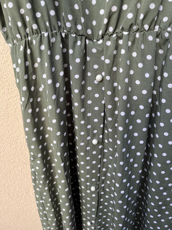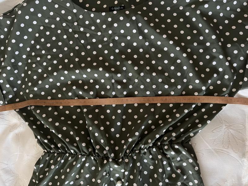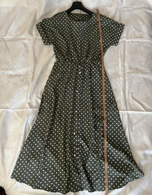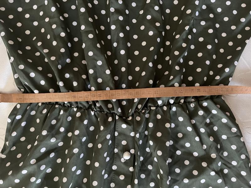 Довжина 129 см, ширина по талії 34 см, гумка тягнеться до 44-45 см. Ширина по грудях 52 см. Низ защібається на ґудзики, є пояс, дві кишені.