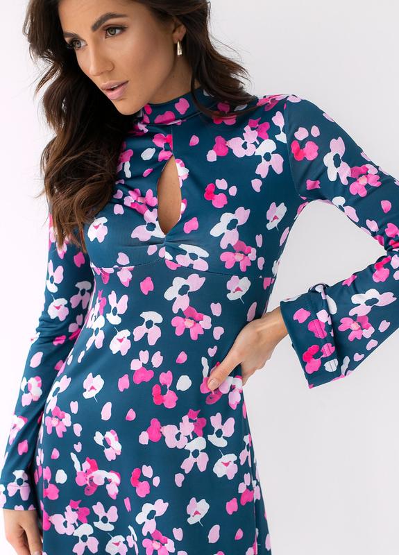 🌸Квіткова коротка сукня з довгими, розширеними до низу рукавами, прикрасить будь-яке свято або побачення. Відрізний ліф прикрашений невеликою зборкою та розрізом у центральному шві. Оригінальний крій сукні доповнює невисокий комір.