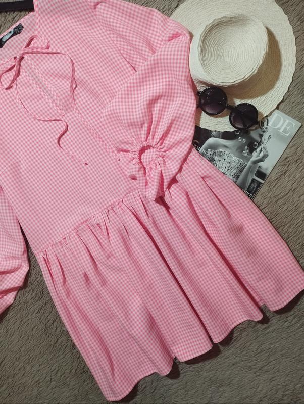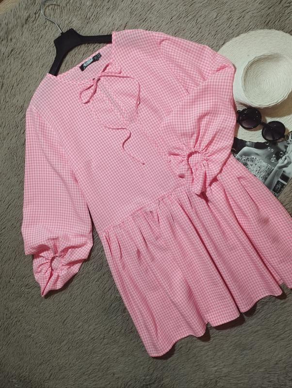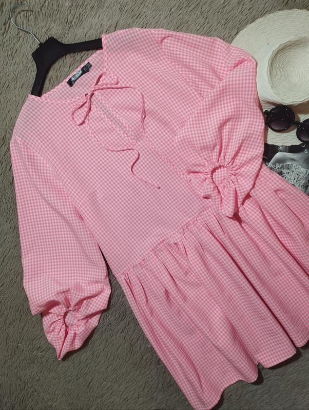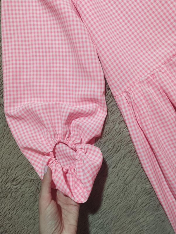 В ідеальному стані. Шикарна сукня з воланом та об'ємними рукавами. Тканина легка, не тягнеться. Виглядає супер 😍 Розмір 12/40/L, але дивіться по замірамЗаміри (напівобхват):Груди 51Талія 50Стегна - вільно Рукав 57 Довжина від плеча 83