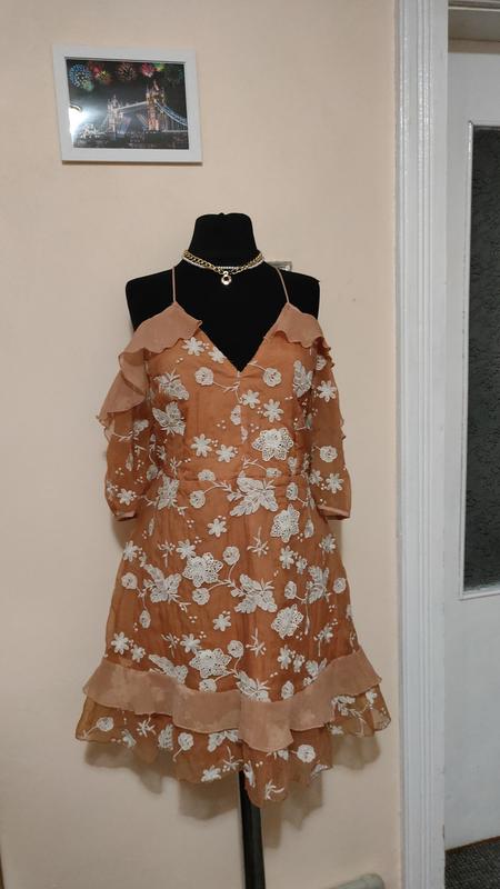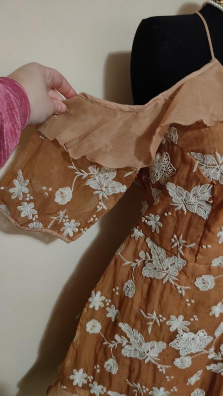 Плаття — мініжіноче коротке літнє, з довгим рукавом-ліхтариком, квіткове, кавове