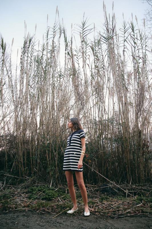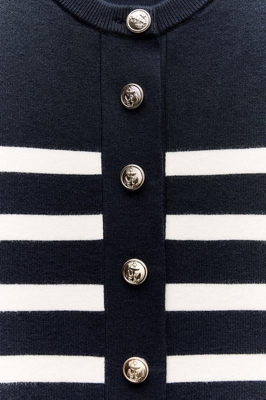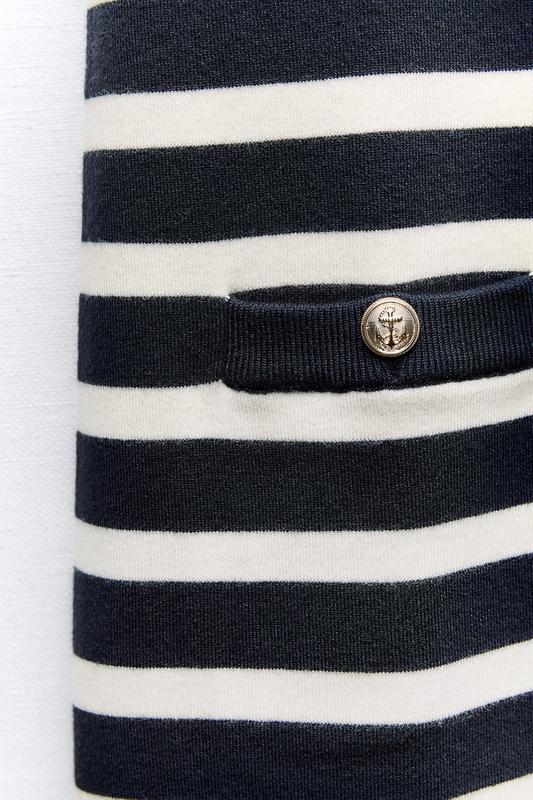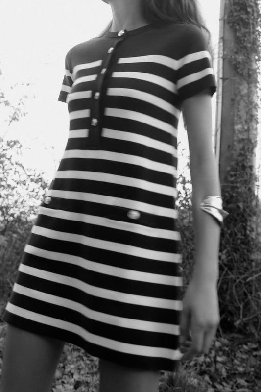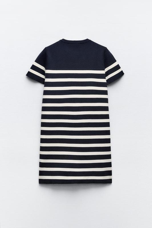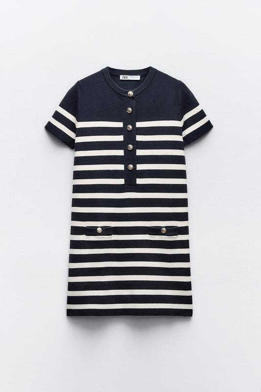 Сукня з круглим коміром і короткими рукавами. Кишені з ґудзиком спереду. Застібається на золотисті ґудзики спереду