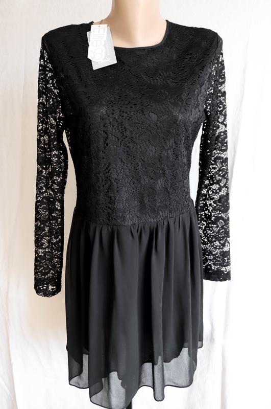 Гарна сукня з мереживним верхом з довгим рукавом. Стан чудовий, склад тканини 20% гіпюр, 80% терілен (високоякісний поліестер). Бренд ELITE99. Розмір L 48. Довжина сукні 90 см, довжина переду 45 см, довжина рукава 62 см, обхват грудей 100 см, обхват талії 82 см.