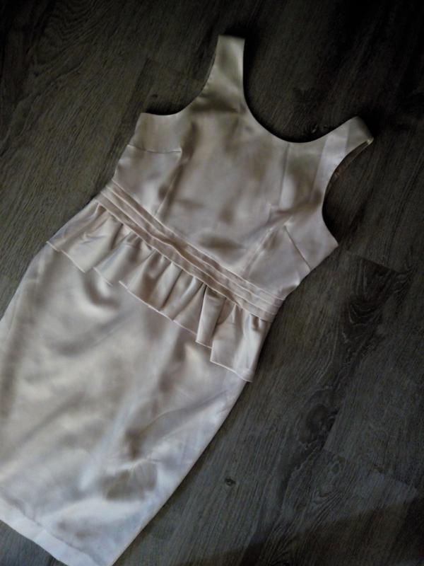 Стильне коктейльне плаття ніжно-кремового кольору з легким відблиском. Баска, чудово акцентує увагу та візуально звужує талію. Прекрасний варіант для святкування твого дня народження, походу на виставку або весілля подружки. На підкладці, ззаду змійка та розріз.