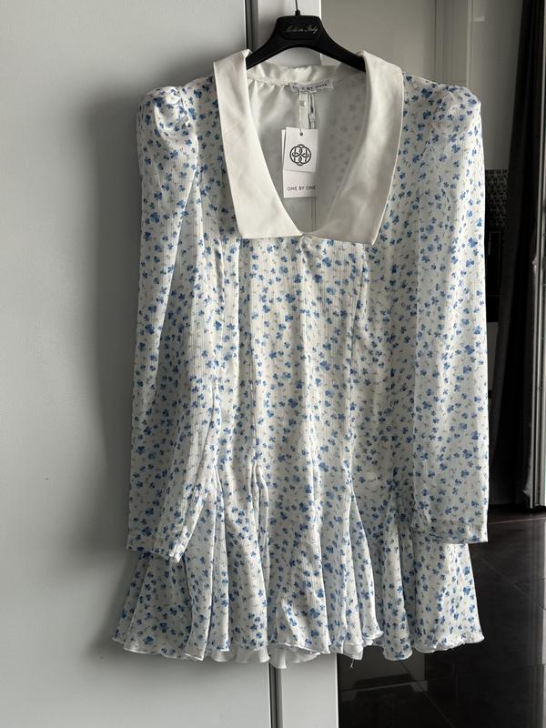 шифонової тканини з напиленням на легкому підкладі. Має ефектно легку текстуру, яка додає жіночності та елегантності. Унікальні деталі у вигляді об'ємних рукавів та відкладного комірця створюють ефектний образ, додаючи вишуканості та розкоші вигляду. Силуетний фасон по талії та легка спідниця вигідно підкреслюють фігуру, створюючи чарівний образ. Підійде для будь-якого важливого заходу - від вечірки до вечірньої прогулянки. Фіксується блискавкою на спинці.