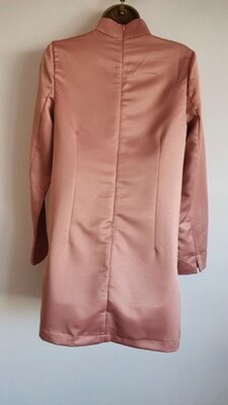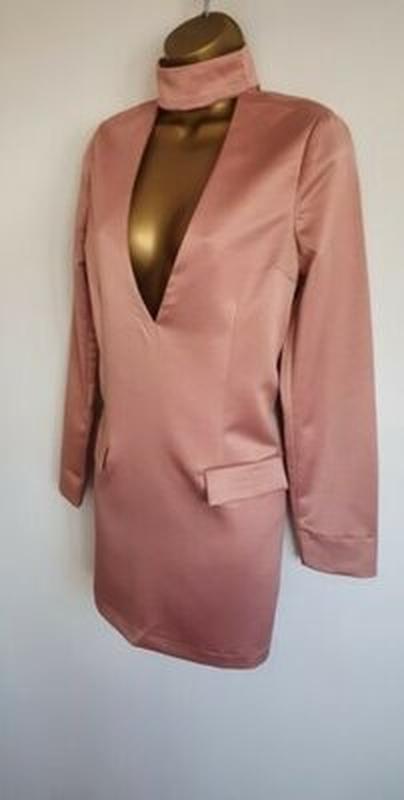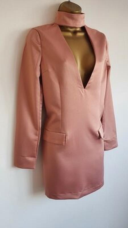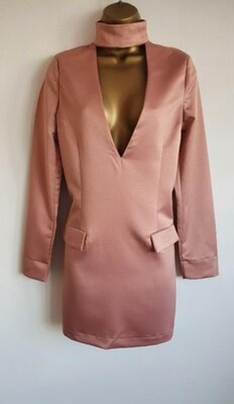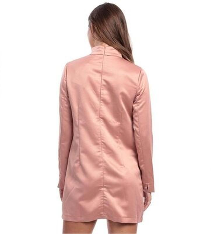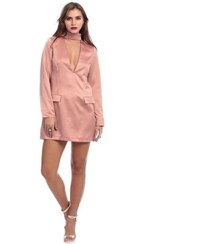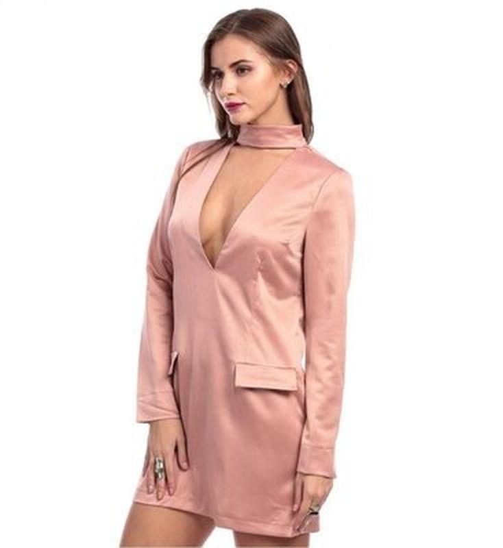 Трендове плаття з чокером і глибоким декольте V-вирізом. Ззаду довга потайна блискавка. Довгі рукави з розрізами на манжетах. Кишені-обманки з клапанами спереду.