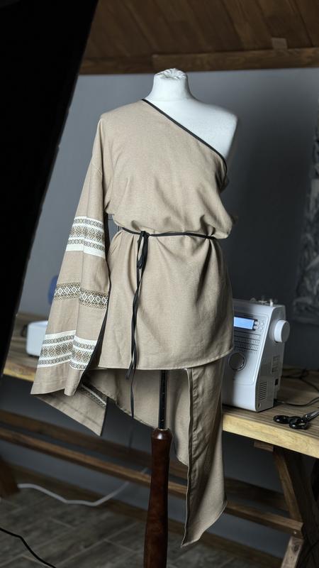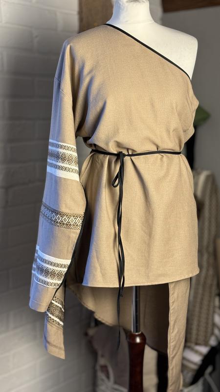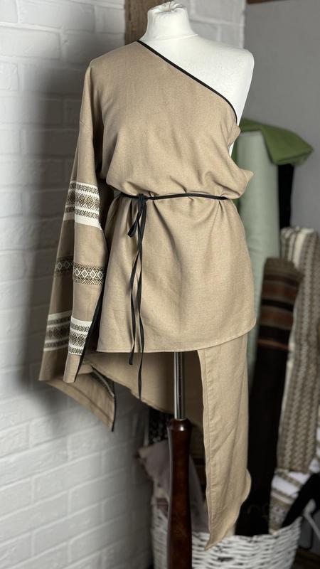 Льняна сукня на одне плече з відкритим рукавом