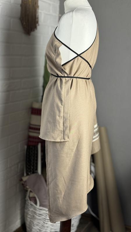 Бежева сукня міні на бретелях та поясом з натурального льону