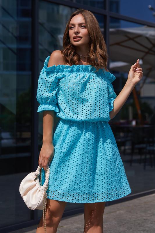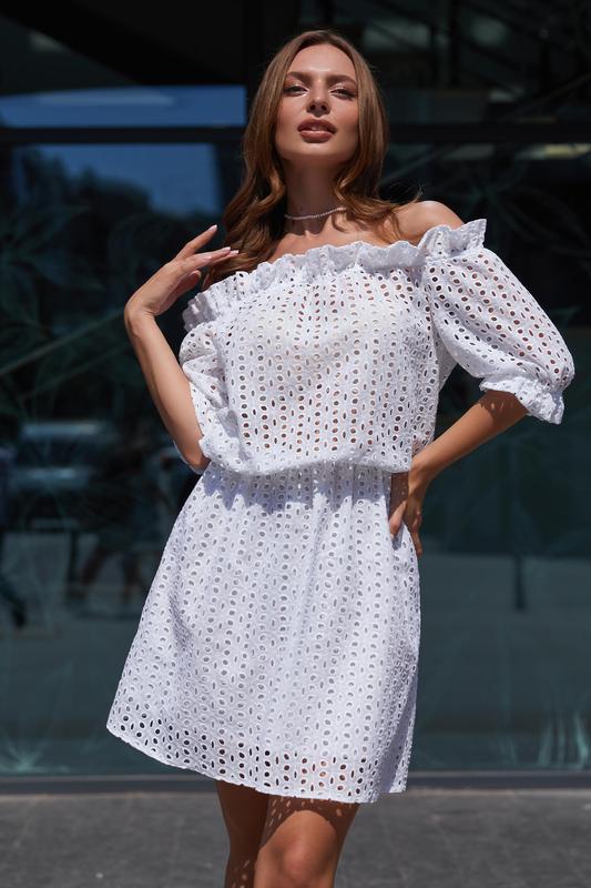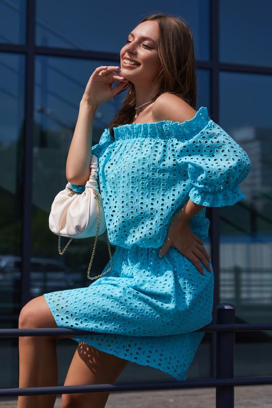 Мила сукня з прошви з підкладкою з натуральної тканини. Оптимальна довжина і рукав реглан надають виробу жіночності та романтичності. Спущені плечі і талія на резинці додають ніжності та витонченості моделі. Спідниця на підкладці.