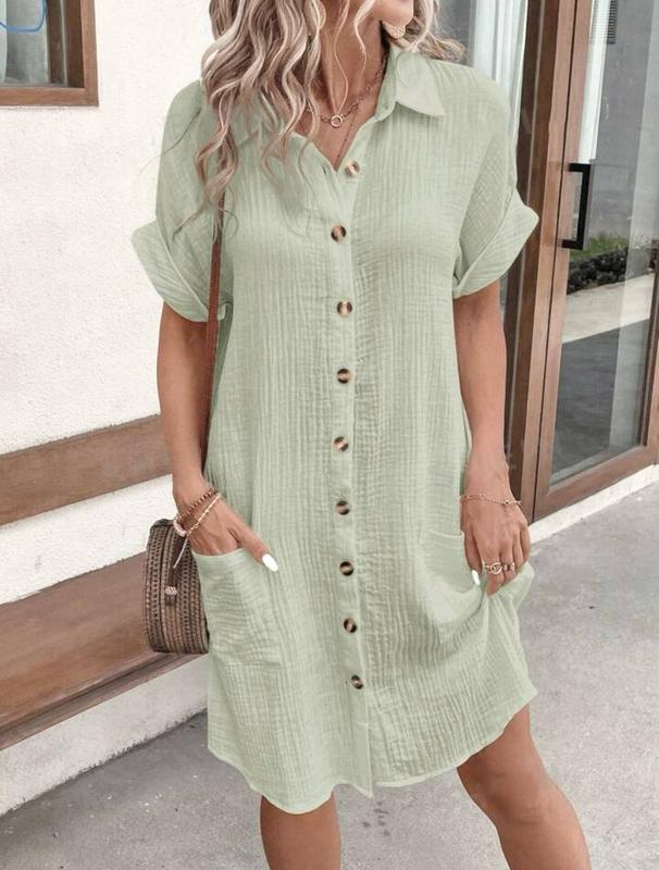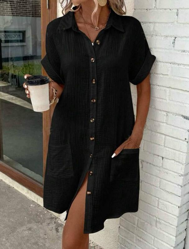 Модель з гудзиками та накладними кишенями – це універсальний та стильний одяг. Фасон плаття має крій сорочки, що надає йому невимушеного вигляду. Легка структура тканини робить це плаття особливо привабливим для літніх прогулянок -96