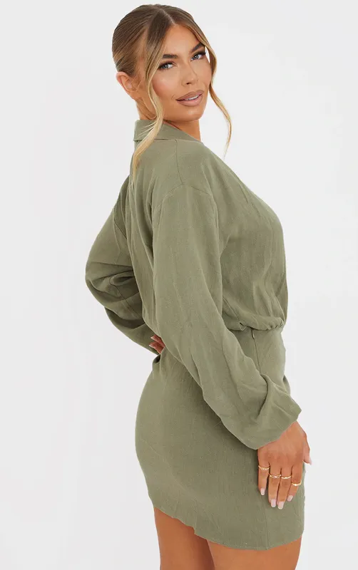 Сукня сорочка кольору хакіБренд: Prettylittlething;Колір: хакі;Склад: віскоза 78%, льон 22%;Розмір: 42/S;ПОГ: 48 см;ПОТ: 37 см;Довжина рукава: 52 см;Довжина виробу: 90 см. Артикул: 21347