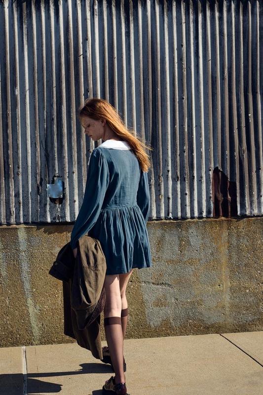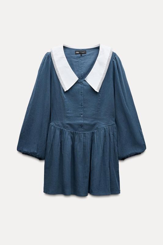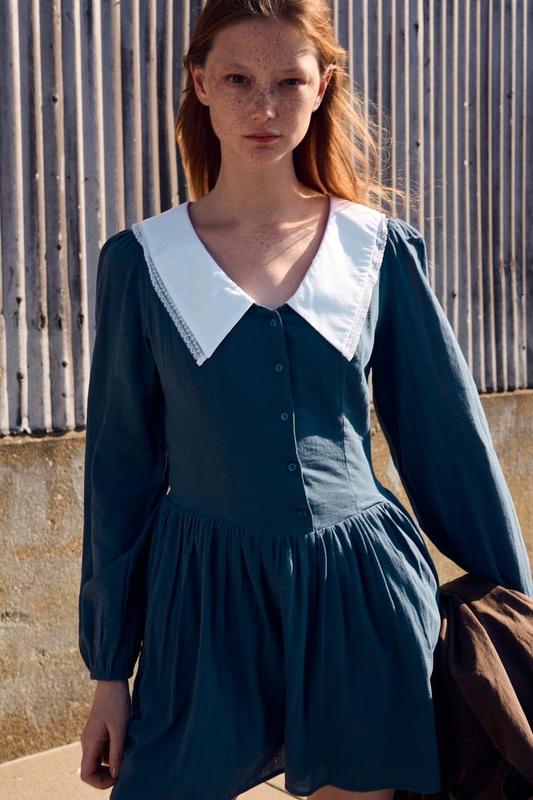Сукня з виложистим коміром із мереживними вставками. V-подібний виріз і довгі рукави з резинкою. Прорізні кишені по боках. Застібається на ґудзики спереду. Підкладка. Невидима блискавка на боці.Світлий зеленувато-синій | 0881/202