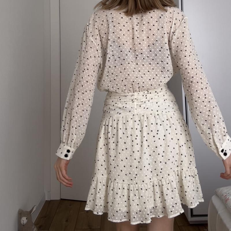 Легенька сукня в принт polka dot з декоративним поясом. Сукня має сорочковий комір з застібкою на ґудзики спереду, довгі рукави та спідницю кльош. Застібається збоку на блискавку.