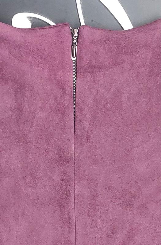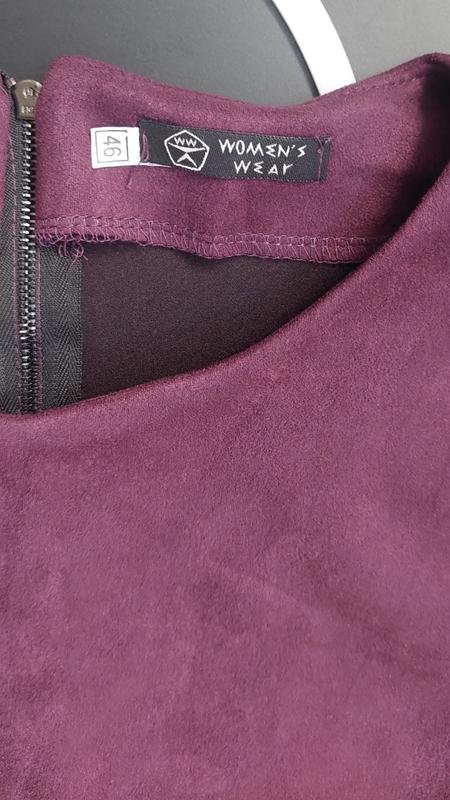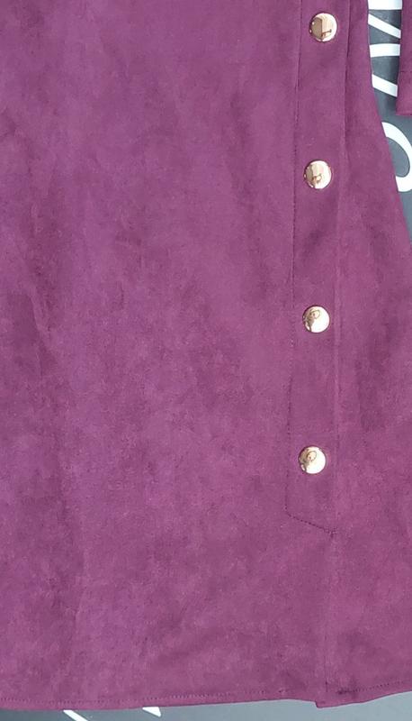 Елегантна жіноча сукня з декоративними золотими ґудзиками збоку, має насичений бордовий колір, схожий на темно-фіолетовий або сливовий відтінок. Сукня виконана з м'якої тканини, типу еко-замші, з рукавами три чверті. Застібається на блискавку ззаду. Ця модель підійде для теплого сезону, як для офісу, так і для неформальних заходів.