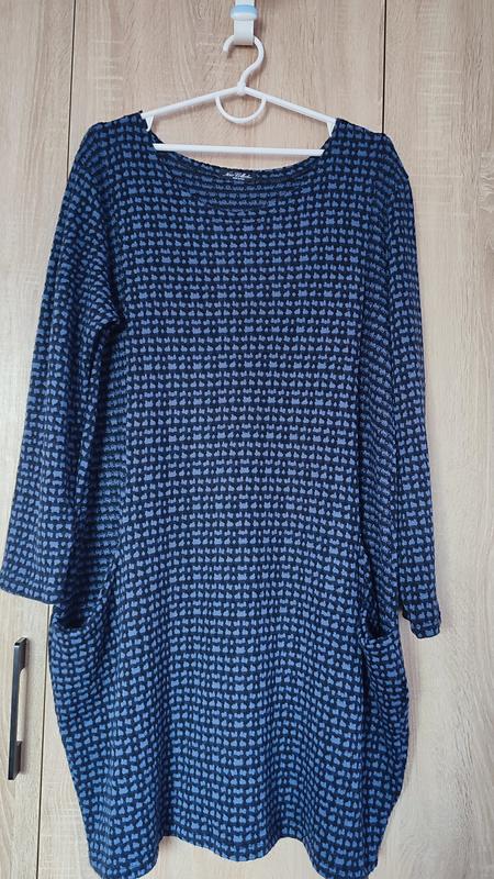 Гарненька тепленька сукня. Стан ідеальний. Колір чорний в синій плямистий принт. В районі стегон є накладні кишені. Красива, стильна фірмова та якісна. Заміри: ПОГ 55-65 ПОС 65 довжина 93 Виробник Італія