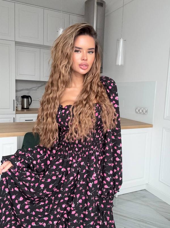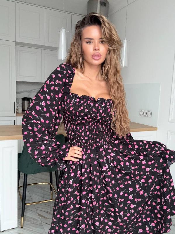 З настрочною резинкою по грудям та спинці, рукава та плечі також на резинці, завдяки чому регулюєте сукню. Супер якість!