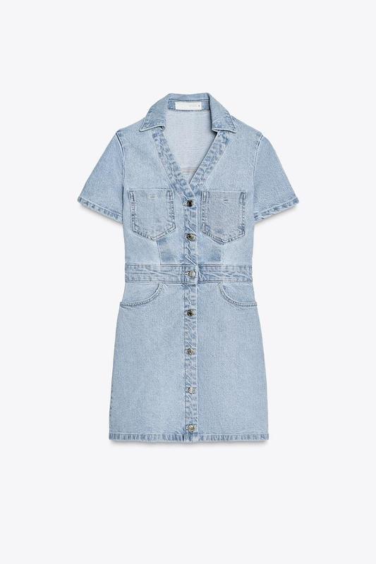 Сукня із сорочковим коміром, вирізом на комірі і короткими рукавами. Кишені спереду, накладні кишені ззаду. Застібається на металеві ґудзики спереду. СВІТЛО-СИНІЙ | 1416/027/406
