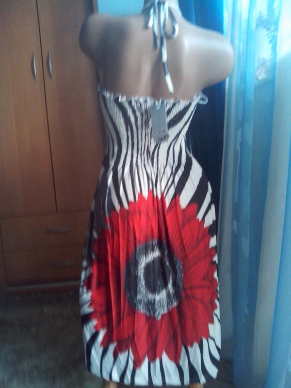 Красиве літнє плаття-сарафан з красивою яскравою квіткою ( і спереду і ззаду ). Зав'язується на шиї прикрасою, верх сукні ( перед та спинка ) на гумках, які добре тягнуться, так само добре і повертаються у звичний обсяг. За рахунок свого вигідного пошиття підійде і на ХЅ, S, m і L. Заміри: ПОГ ( в спокійному стані ) - 30 см, тягнеться до 55 см, довжина - 73 см (без брителей, тобто самого виробу від ліфа до низу) - при середньому зрості йде по коліно, ПОТ і ПОБ - спідничка йде вільна. Тканина - трикотаж-масло ( або "холодний трикотаж" ), склад: 95% поліестер, 5% спандекс. Дівчатка, запитуйте, будь ласка, красиве і яскраве!