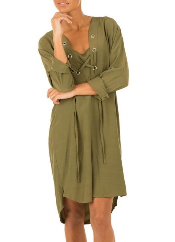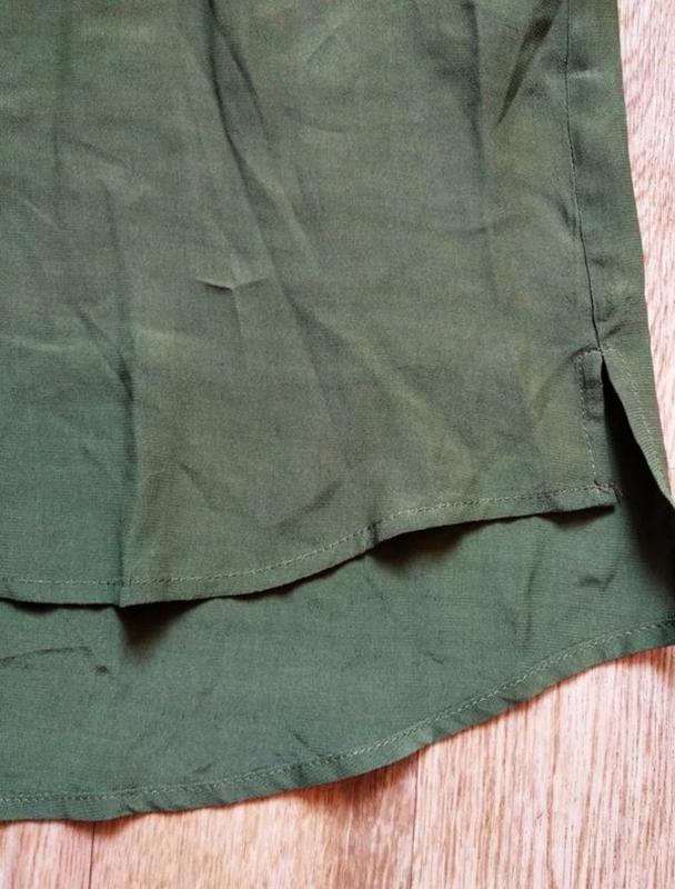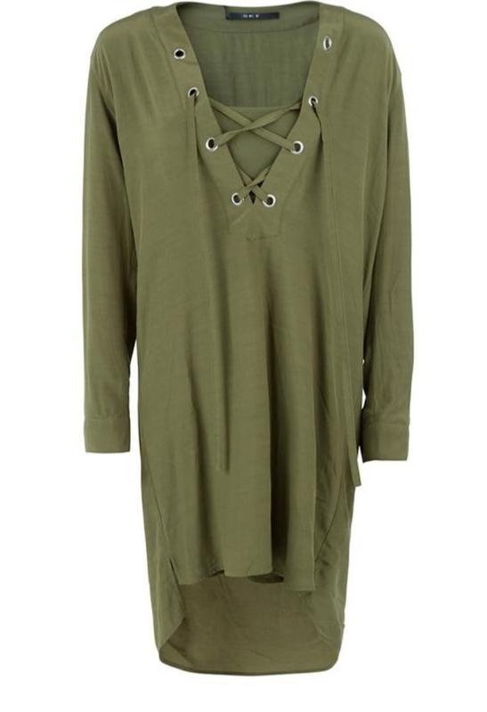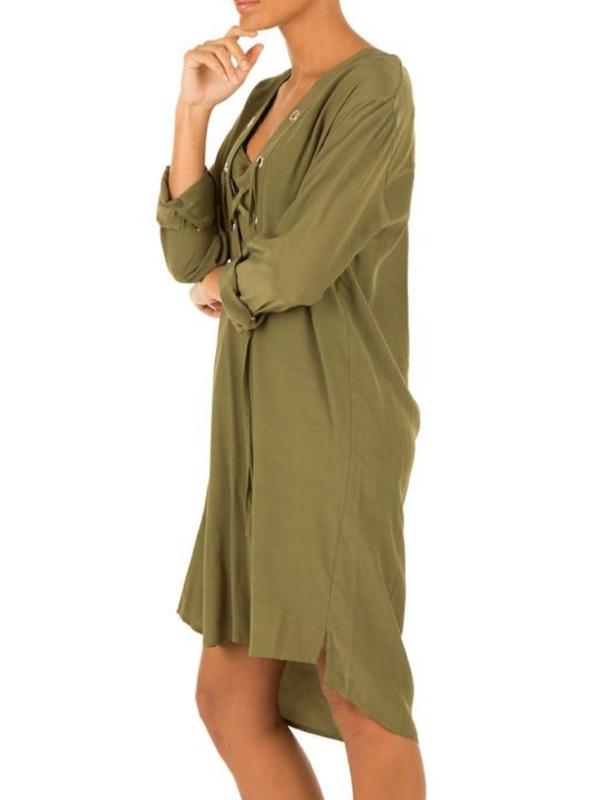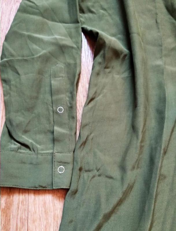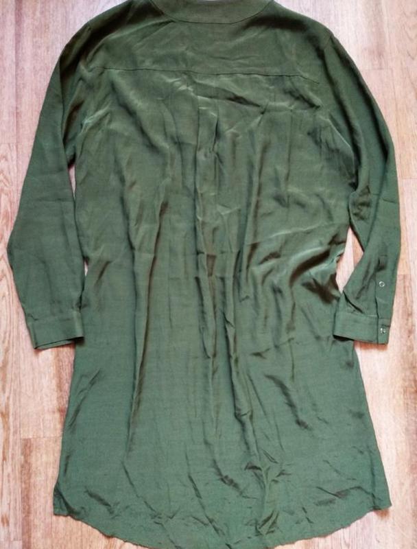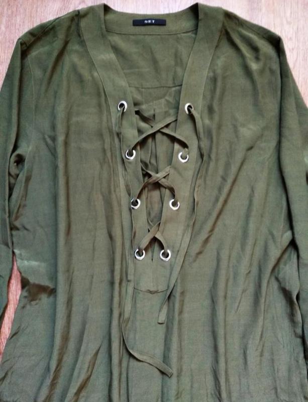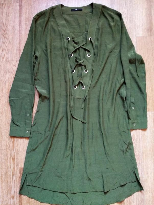 Стильное платье-рубашка из 100% вискозы от очень дорогого бренда SET в красивом оливковом оттенке. Спереди вверху глубокий V-образный вырез на шнуровке (без подложки, открытый!). Спинка удлиненная, подол заокругленный с небольшими разрезами, манжеты на двух кнопках + запасная в комплекте.