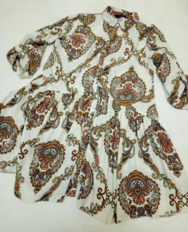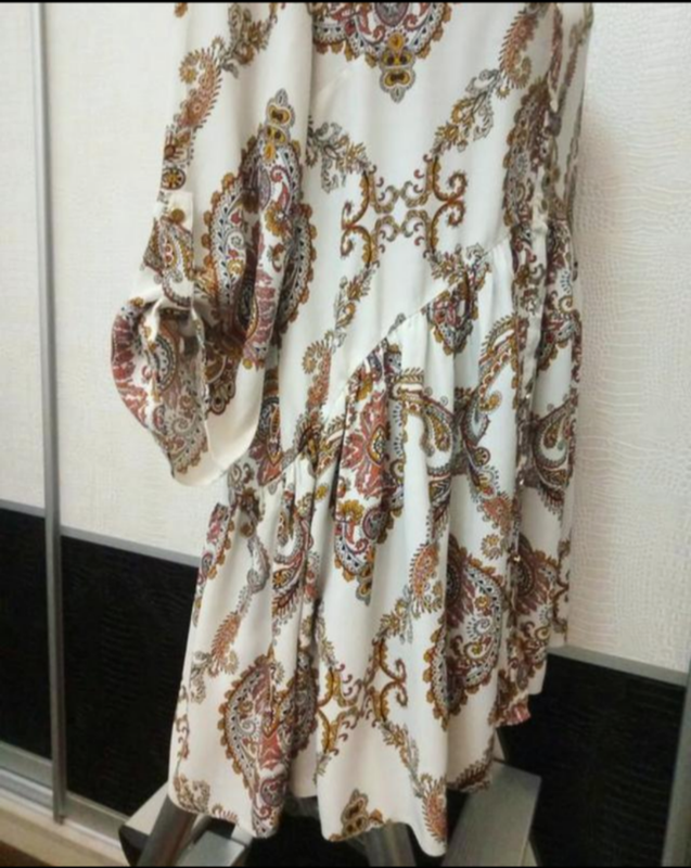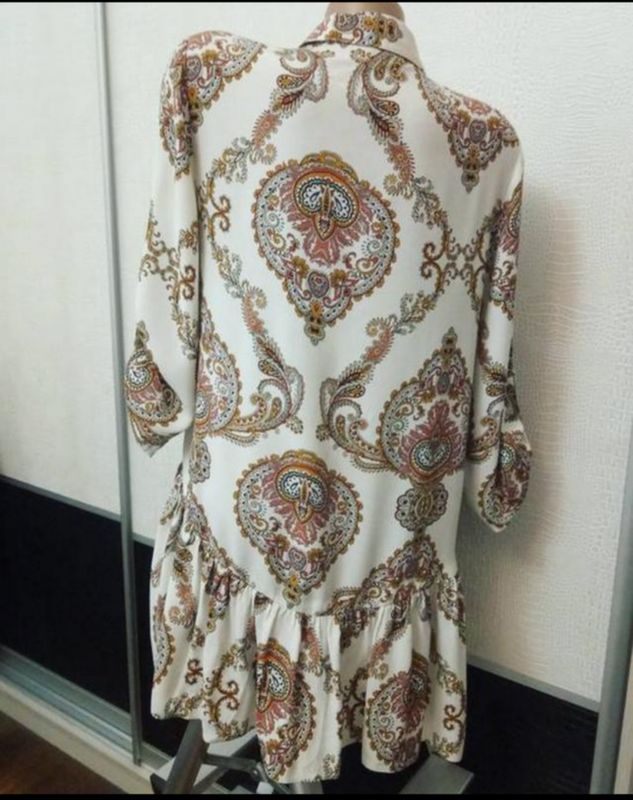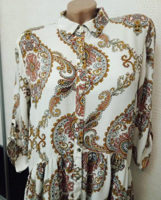 Шикарне міні сукня туніка,можна одягати як подобається. UK 12 Вільний крій. Дуже гарний малюнок і пошиття. Комірець сорочковий. Рукав підкочується. Довжина по спинці 81-82см плечі 40см рукав 45см ширина між пахвами 51см Піт 55см