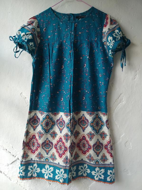Дуже гарне плаття, туніка від відомого бренду одягу. Надзвичайно гарний колір морської хвилі або насичений глибокий смарагд, в дрібну квіточку. Смужка красивого орнаменту по низу сукні. Рукава короткі, трохи ліхтариком, на зав'язочках. Ззаду на спинці на гудзиках. Довжина до колін.
