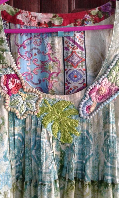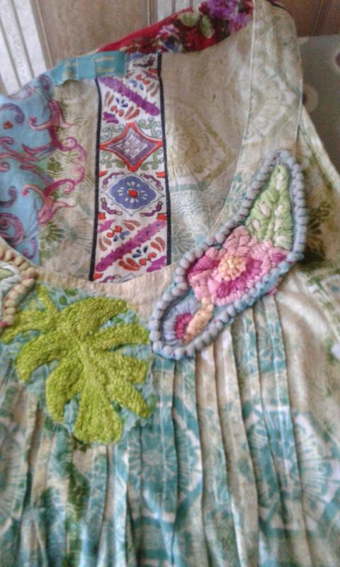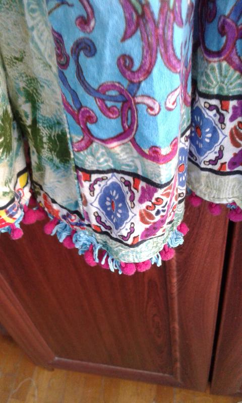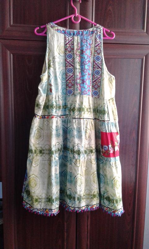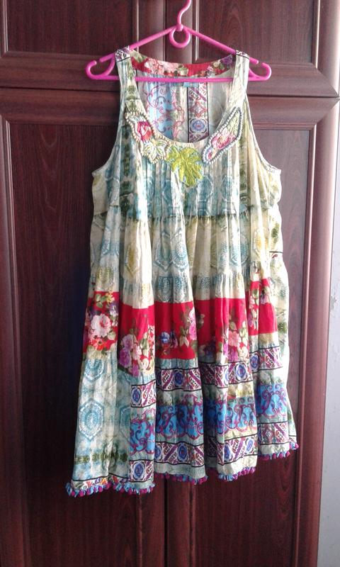 Дизайнерське бавовняне коротке плаття сарафан antica sartaria by giacomo cinque з вишивкою , китицями , бохо етно стиль .Бренд Італія ,вироблено в Індії . Ручна робота. Дуже зручно вагітним в жарку погоду . Основний колір салатовий .З різними елементами вишивки ,аплікації ,бахроми .Сильно розкльошені попереду , навколо вирізу защипи .Сток без паперової бирки .Заміри :ПОГ-55 , Довжина - 91,5 .