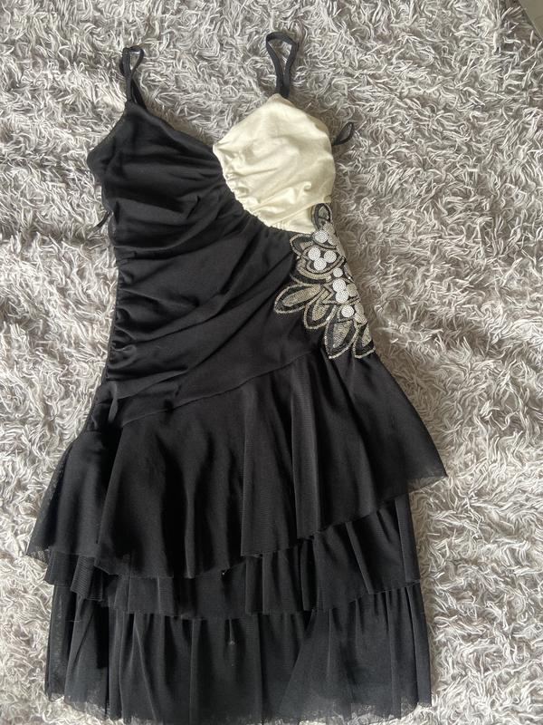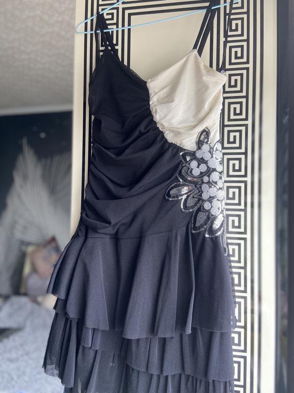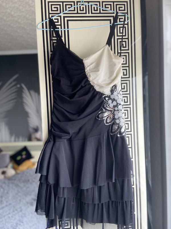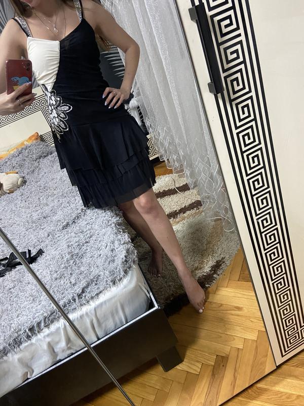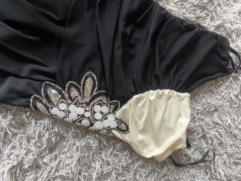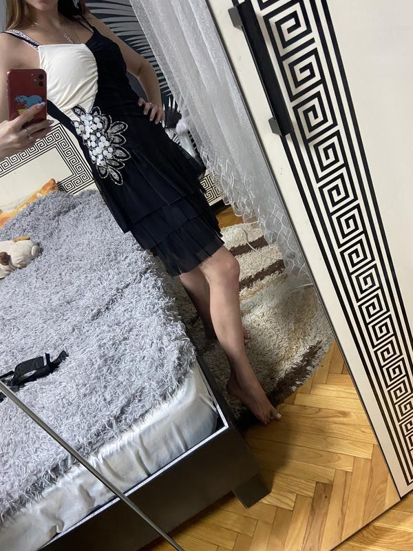 Дуже гарний сарафан з драпіруванням, з боку аплікація, яка гарно відблискує та не морщинця при носці. Є трикотажна підкладка, не світиться. Розм хс, підійде на с