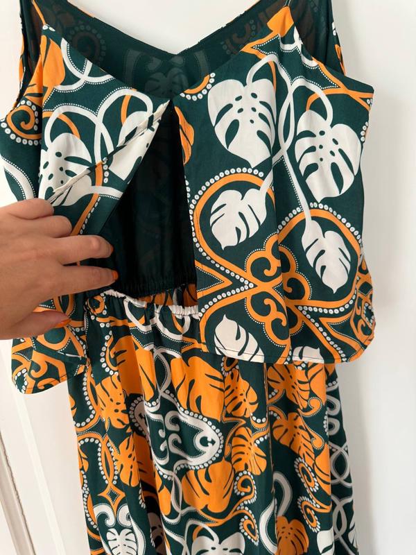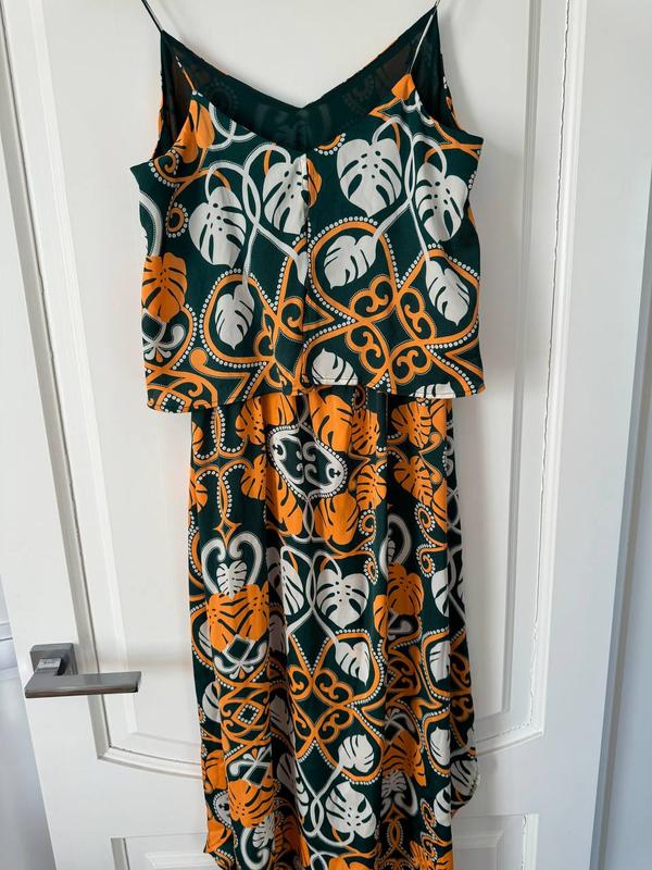продам літню сукню H&M. розмір М. В ідеальному стані. Верхній шар - сатин, є внутрішн підкладка. спинка - напівідкрита (прикривається воланом з розрізом. по талії еластична резинка. напівобхват по груді - 41 см. загальна довжина - 126 см.
