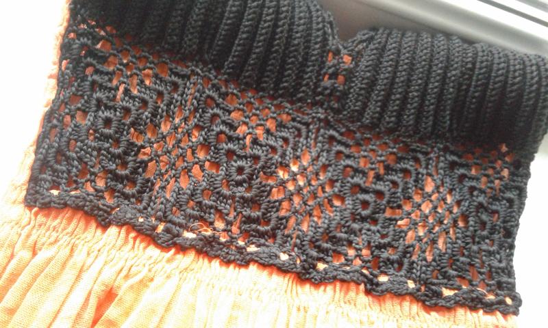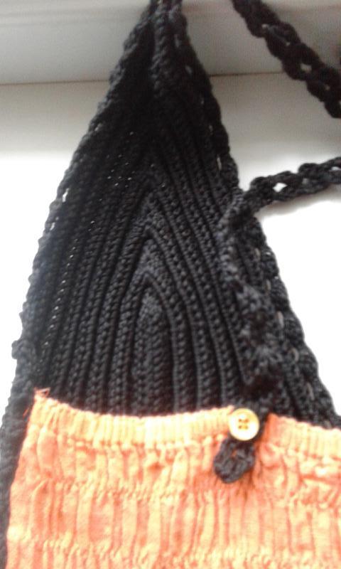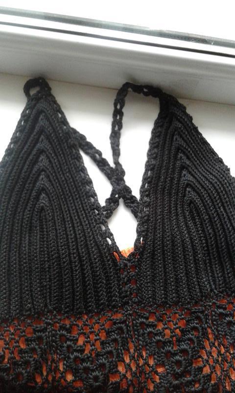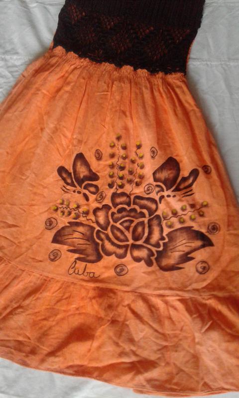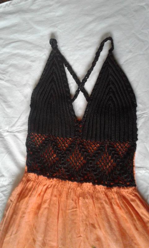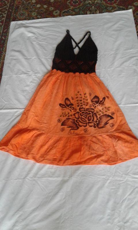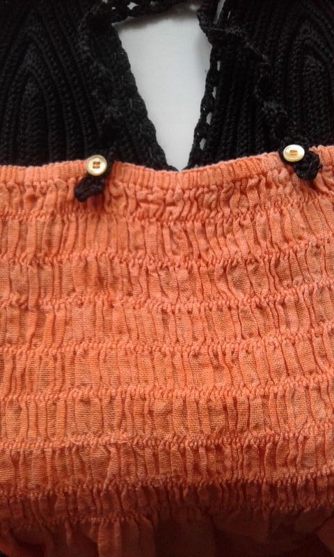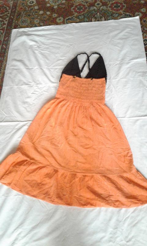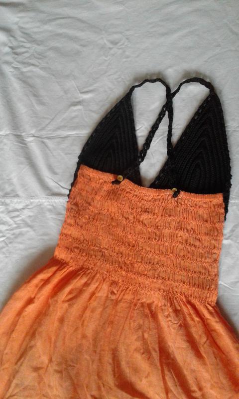 Сарафан літній пляжний комбінований жовтогарячий, абрикосовий із чорним, спереду чорний в'язаний гачком ліф, ззаду ліф призбираний на гумку. Тканина бавовна.Довжина міді.Ручна робота. Відрізний під грудьми, по подолу широка оборка.Впереду на спідниці великий принт чорного кольору — квітка.Тонні бретелі на спинці закріплені ґудзиками.Заміри у вільному стані: НОГ — 32 напівобхватність під грудьми —31, Довжина від пахви — 83,5.